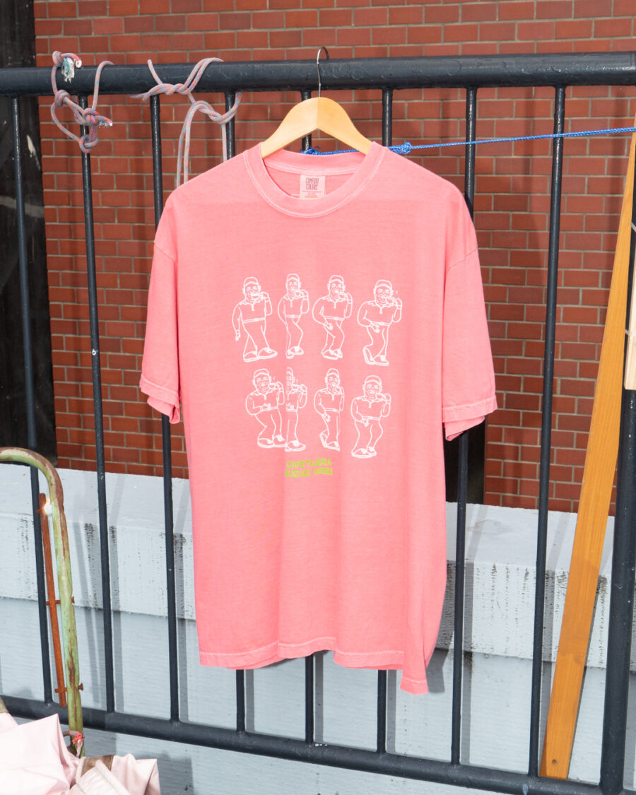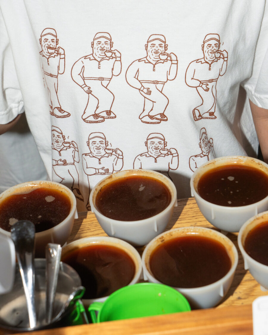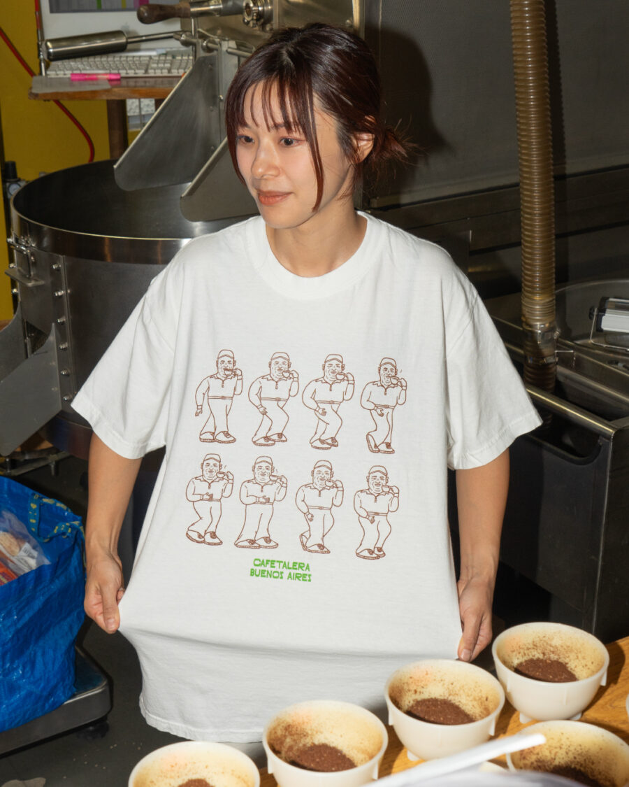 このイラストレーションは、2024年のCOE1位取り扱い時に祝意と感謝、リスペクトを込めてアーティスト・NONCHELEEE氏に描いてもらったもの。世界各地で話題を呼んだ(!?)、「コーヒーのおいしさのあまり思わずステップを踏むオルマン氏」が、今回ついにTシャツになりました!